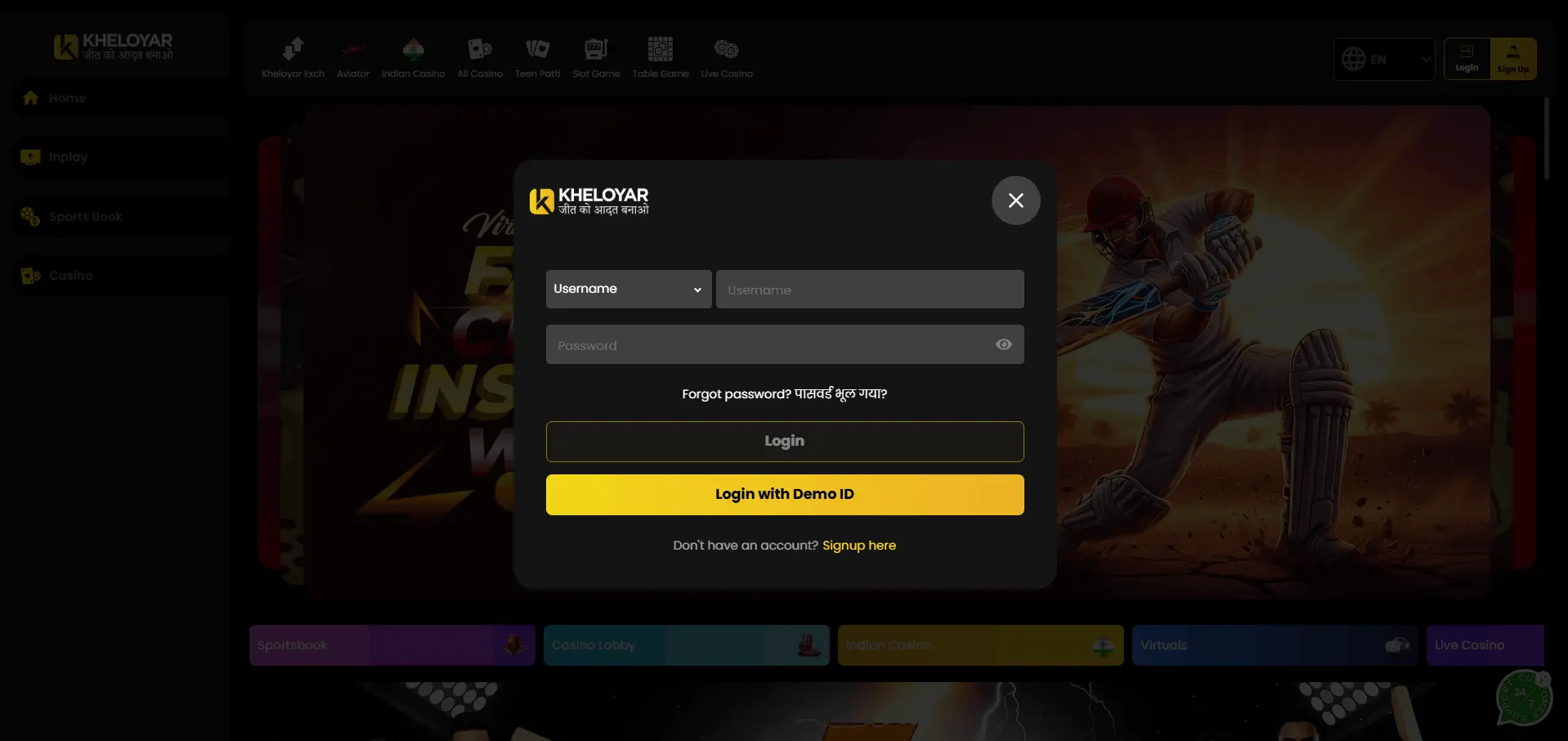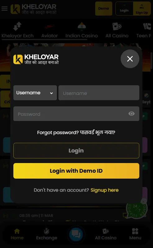 Once you get your cricket betting ID online, the next step is Kheloyar login. Follow these steps to log in to your Kheloyar account: